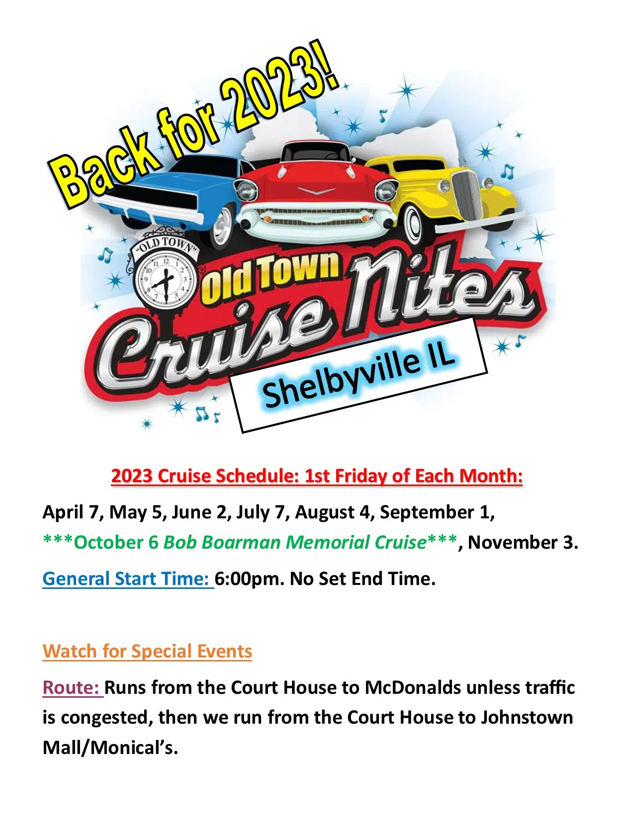 Old Town Cruise Nights are back in Shelbyville this year, the first Friday of the month. They’ll start at 6:00 p.m. at the courthouse and cruise west down Main Street. All vehicles are welcome.