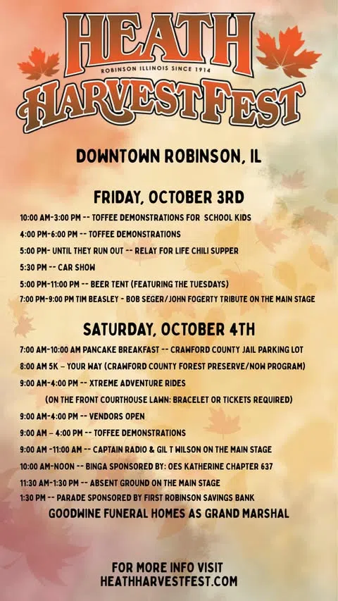 Robinson, IL hosts the annual Heath Harvest Fest each October. Since 1914 the Heath company has been a household name here in Robinson. The Heath Harvest Fest is a celebration in honor of Heath and a festival that brings in folks from all over.