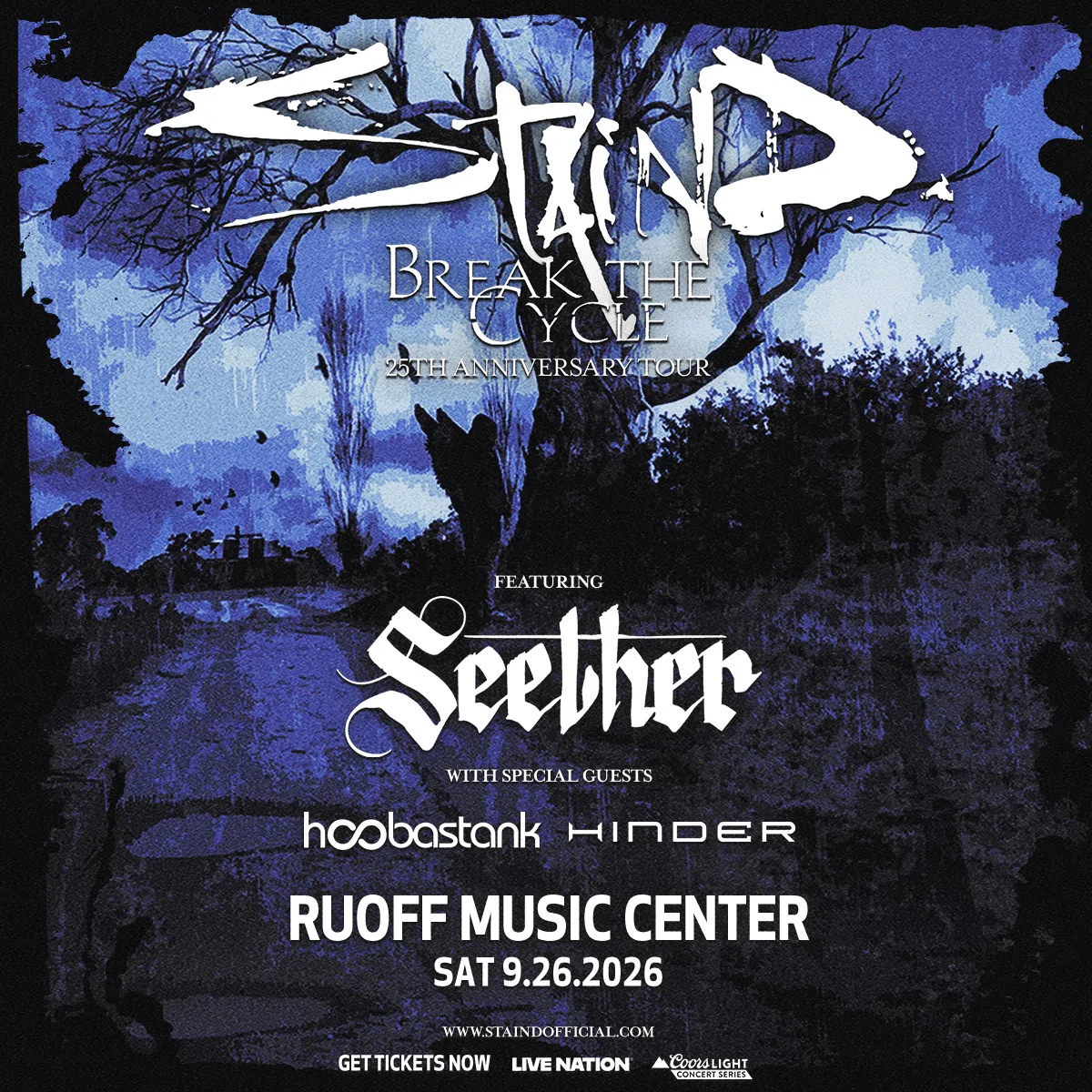 For Release STAIND live at Ruoff Music Center on Sat, Sept. 26 with Seether, Hoobastank & Hinder INDIANAPOLIS, IN (February 3, 2026) - Multi-plati...